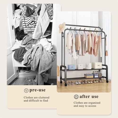 - 【قل مرحبًا بحل التخزين النهائي】مع قضيبين لتعليق الملابس، ورفين مزدوجين، وأربع شماعات قوية، يوفر رف الملابس مع مساحة لا مثيل لها لجميع أغراضك. من الملابس والاكسسوارات إلى الشنط والأحذية والمزيد، يجد كل غرض مكانه المخصص بسهولة. علّق ملابسك بشكل منظم على القضيبين المزدوجين، وضع الملابس المطوية أو الأحذية على الأرفف، واستفد من الأربع علاقات للوصول السريع والسهل إلى أغراضك المستخدمة بشكل متكرر. حافظ على غرفتك أنيقة بشكل مناسب.