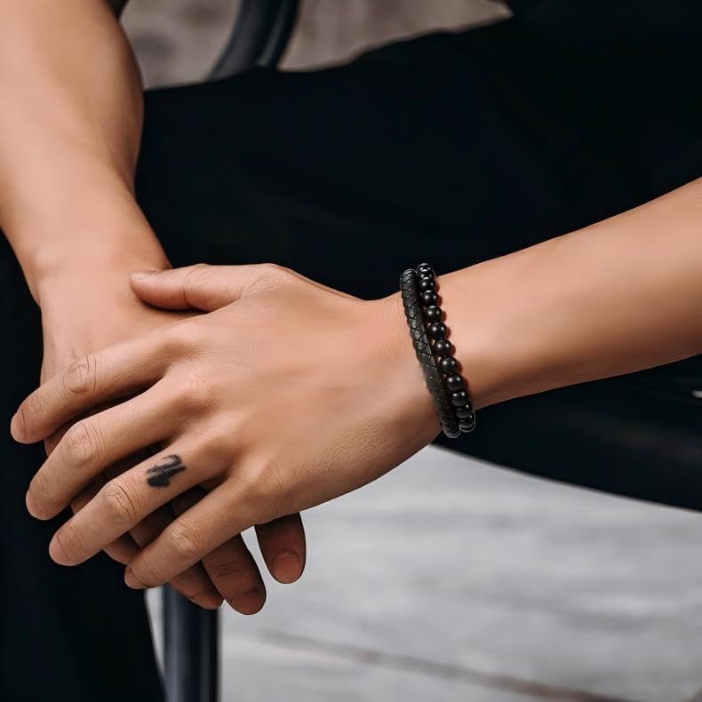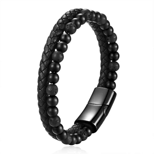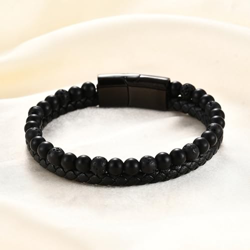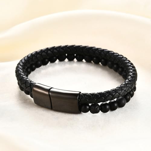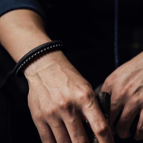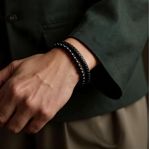 MYNENEY - سوار من الجلد والفولاذ المقاوم للصدأ وحجر عين النمر مع خرز، سوار مزدوج الطبقات منسوج يدويًا للرجال من مينيني