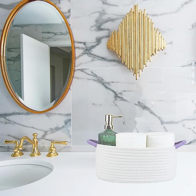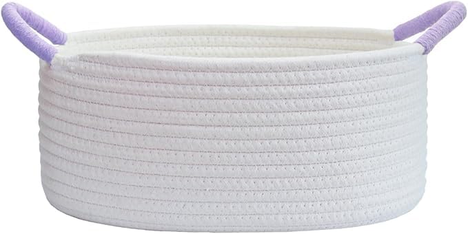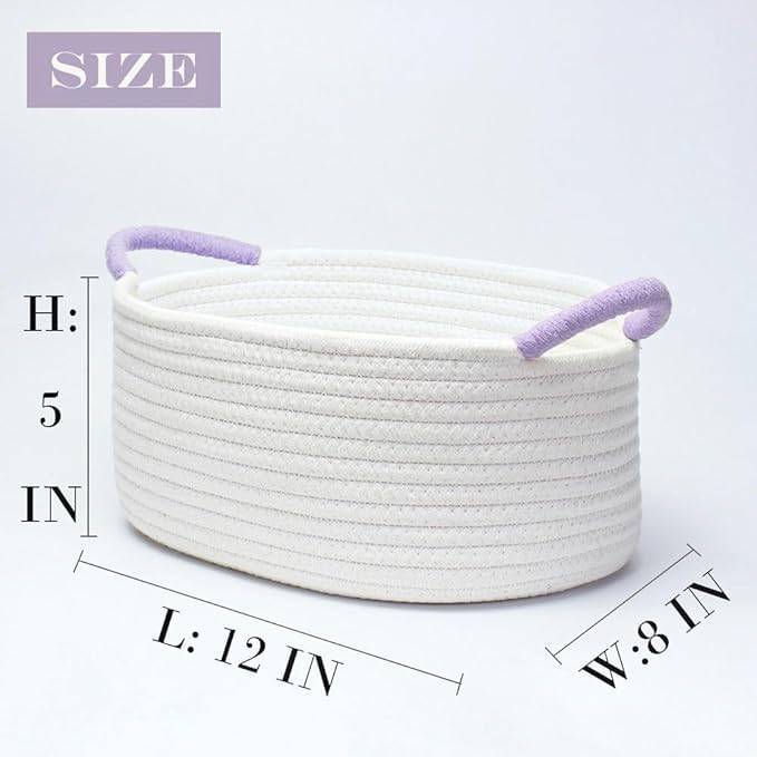 Generic - سلال هدايا فارغة، سلال منسوجة لطيفة للتخزين، سلال صغيرة من الحبال القطنية البيضاء بمقابض ارجوانية للنساء والرضع والاطفال وتخزين الحيوانات الاليفة (بيضاوية، 12×8×5 انش) من MZ