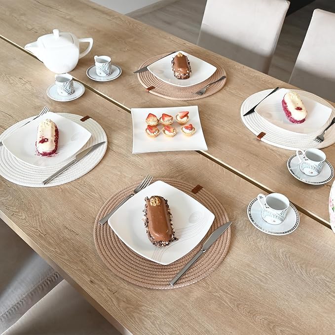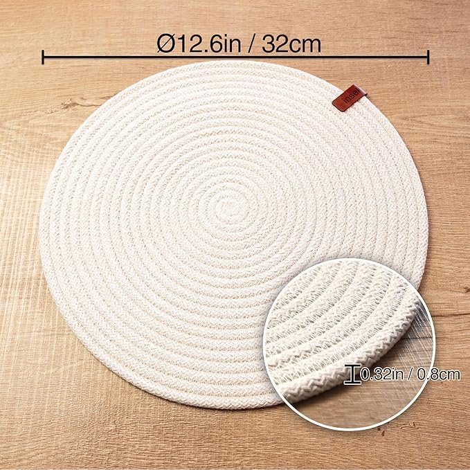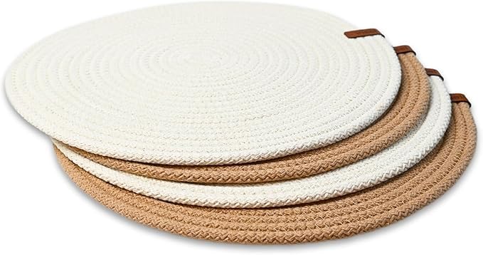 - لطاولات أنيقة. تتضمن العبوة 4 مفارش أطباق دائرية مصنوعة من حبل قطني مضفر عالي الجودة بحرفية استثنائية من قبل حرفيين أتراك محليين، متينة وقوية، يمكن استخدامها على كلا الجانبين، وتدوم لفترة طويلة.