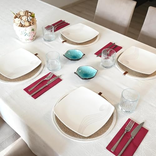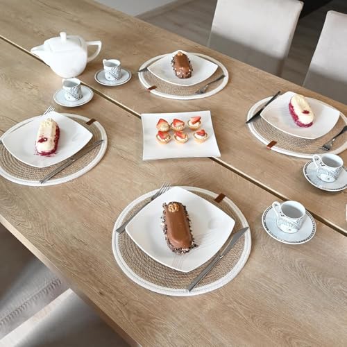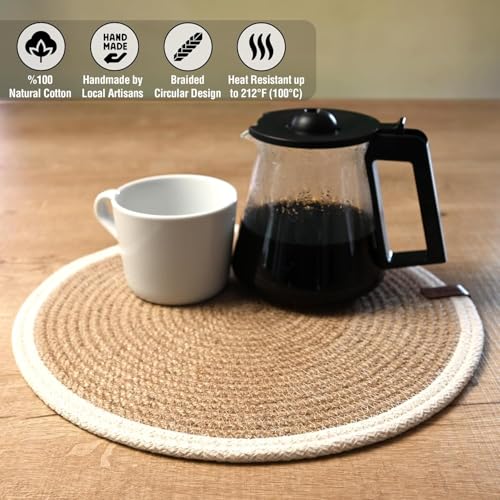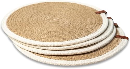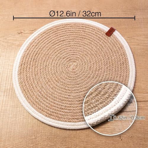 Generic - مجموعة مفارش مستديرة مصنوعة يدويا من الجوت الطبيعي المضفر مع حبل قطني ابيض من ام زد مكونة من 4 قطع، القطر 32 سم، مقاوم للحرارة، مزدوج الجوانب، بني فاتح (قابل للغسل)