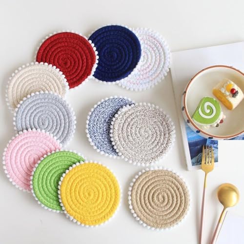 Generic - مجموعة قواعد اكواب دائرية للمشروبات من ام زد مكونة من 4 قطع، مجموعة قواعد اكواب مصنوعة من حبل قطني منسوج يدويا مع كرة شعر، قواعد اكواب عازلة للحرارة بنمط بوهو لتزيين الطاولة، احمر (قابل للغسل) (قطن