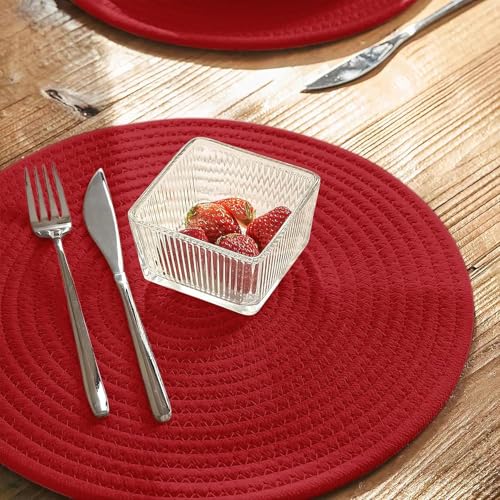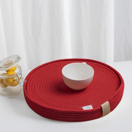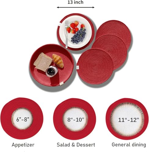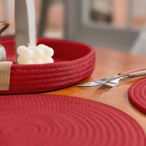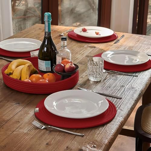 Generic - مفرش أطباق مستدير مصنوع من حبال قطنية منسوجة وغير قابل للانزلاق ومقاوم للحرارة ومعه حامل متضمن لديكور ترابيزتك من ام زد، 4 قطع (أحمر، 33 سم)(قابل للغسل)(قطن طبيعي).