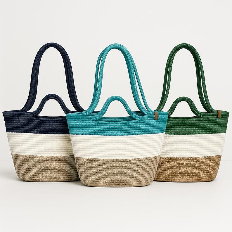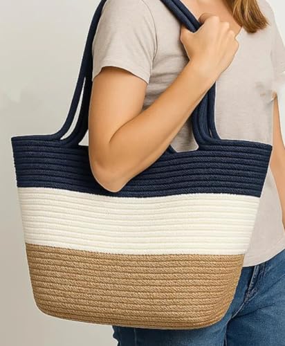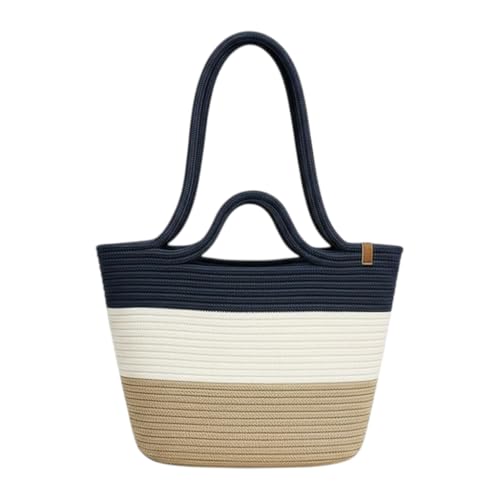 Generic - شنطة توت للشاطئ منسوجة من القش من ام زد، ازرق كحلي وابيض وتصميم طبيعي ثلاثي الالوان، مقابض كتف كبيرة