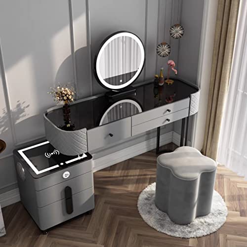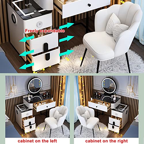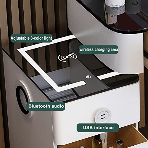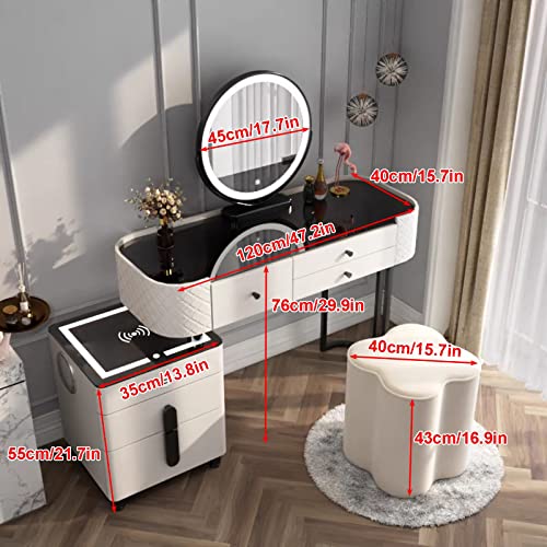 MZEER - طاولة مكياج مع منضدة، مجموعة طاولة تسريحة من مزير، طاولة زينة مع مراة LED قابلة للتعديل، مقعد مبطن، صوت ازرق، شحن لاسلكي (اللون: ايه، المقاس: 12 زيني