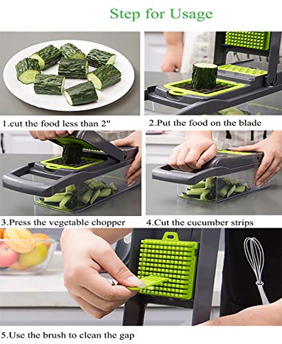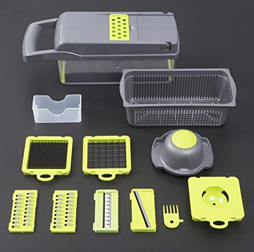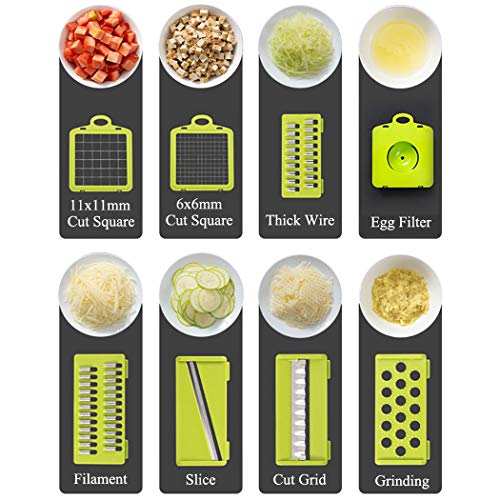 - قطاعة خضروات متعددة الوظائف: قطاعة خضروات 12 في 1، تأتي قطاعة الخضروات مع 7 شفرات مختلفة وأداة فصل البياض عن الصفار بالبيض وسلة تصريف وأداة تنظيف وواقي يد ومقشرة. تسمح الشفرات بالمرونة في تقطيع الفواكه والخضروات بسهولة وتقطيعها بأشكال وأحجام في أقل وقت.