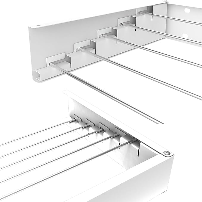 - [زيادة كفاءة استخدام المساحة] استمتع بمتعة تحسين المساحة الخاصة بك وتوفير المال والغرفة مع رف الغسيل N.S STEEL المثبت على الحائط. بفضل تصميمه الذكي القابل للطي والمواد عالية الجودة، لن تحتاج إلى استبداله كل عام مقارنةً برف التجفيف الرخيص الآخر وسيكون لديك منطقة غسيل منظمة جيدًا