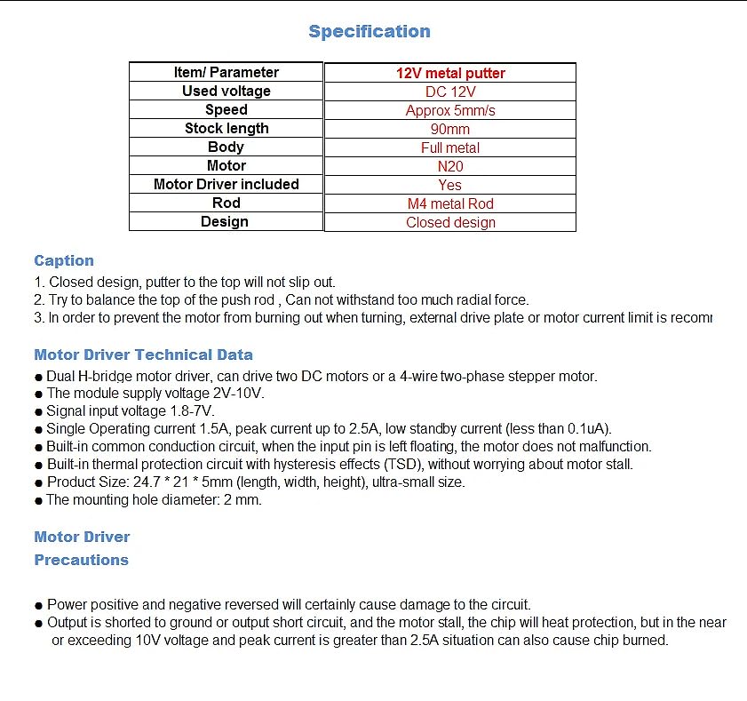 - مصدر طاقة 12 فولت، دفع 5 كجم، السرعة 5 ملم/ ثانية