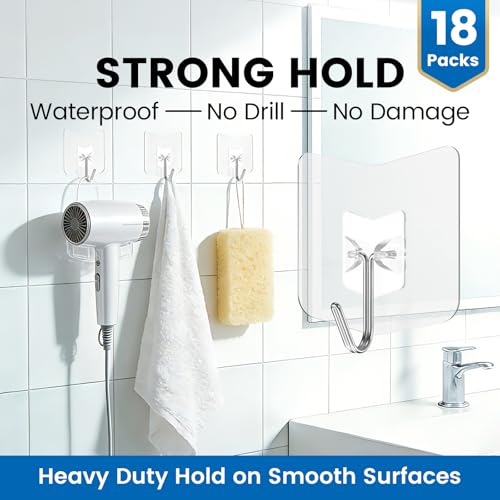 nabreeli - خطافات نانو لاصقة للتعليق من نابريلي، 18 قطعة، خطافات حائط شديدة التحمل 22 باوند من الستانلس ستيل 304، خطاف منشفة ذاتي اللصق مقاوم للماء، خطافات لاصقة شفافة للمطبخ والباب الزجاجي (18)
