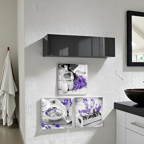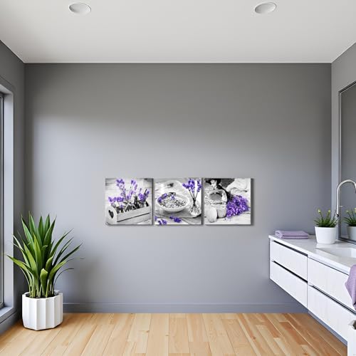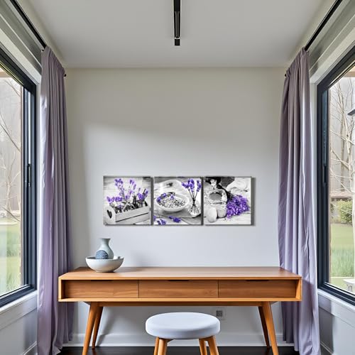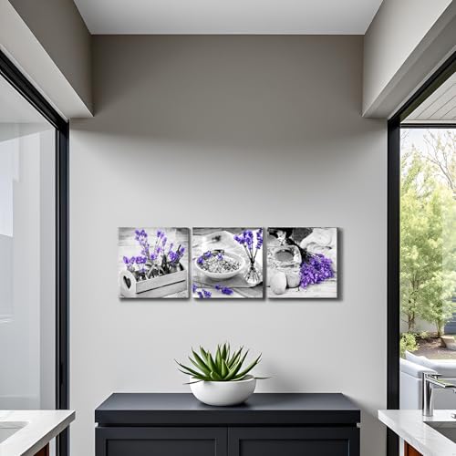 Nachic Wall - لوحة فنية جدارية قماشية لغرفة النوم والحمام وديكور الحائط بطباعة زهرة لافندر أرجوانيية وحجر زين من ناشيك وول، عمل فني لطبيعة صامتة مستوحاة من السبا، مؤطرة وجاهزة للتعليق، 3 قطع
