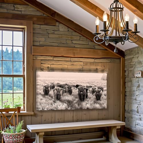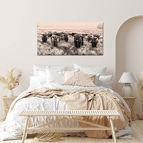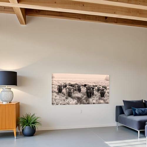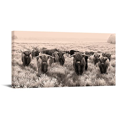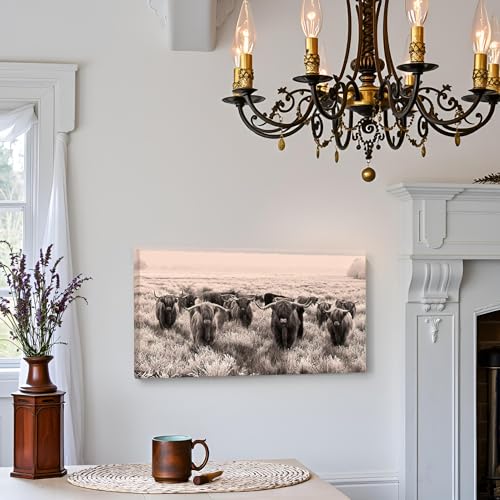 Nachic Wall - ناشيك وول لوحة فنية جدارية كبيرة من قماش بقرة هايلاند بني داكن صورة الماشية الاسكتلندية الشتاء المناظر الطبيعية لمنزل المزرعة وغرفة المعيشة والمطبخ والمعرض والتفاف جاهز للتعليق 24 انش × 48