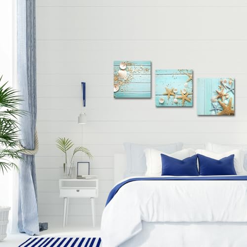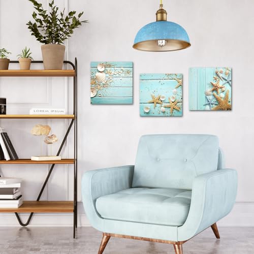 Nachic Wall - لوحة فنية جدارية من القماش على شكل صدف ونجم البحر بطلاء عصري، ديكور حائط عصري للبحر والمحيط، بوستر قماشي لغرفة النوم والحمام بإطار ممتد جاهز للتعليق من ناتشيك، لون أزرق مخضر