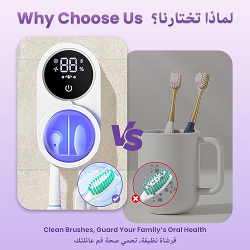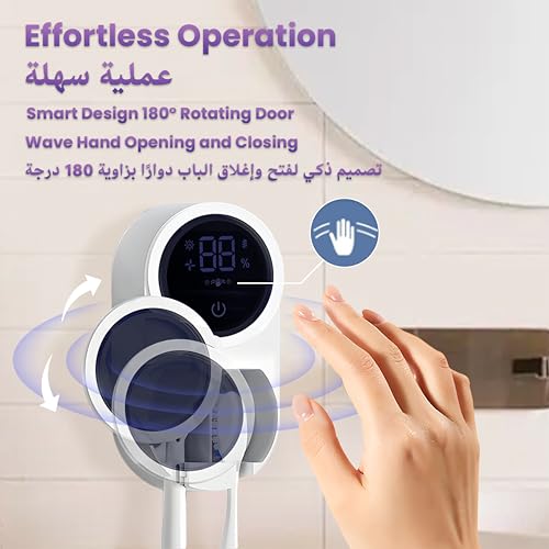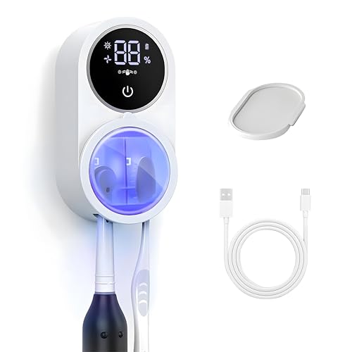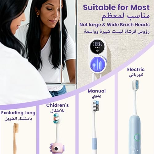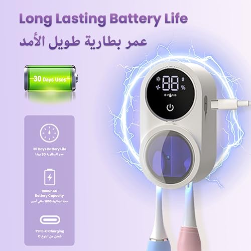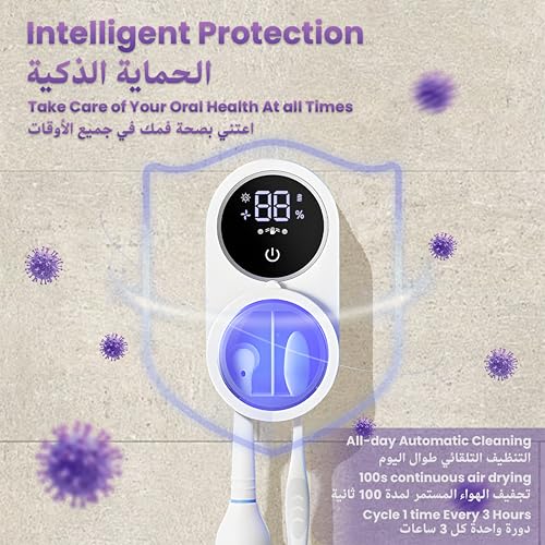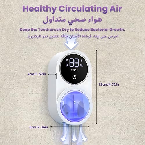 NAFAS - حامل معقم لفرشاة الاسنان من نافاس للتنظيف والتجفيف بالهواء بالاشعة فوق البنفسجية، حامل يثبت على الحائط، فتحتان لفرشاة الاسنان، شاشة LED، حامل فرشاة اسنان محمول وقابل لاعادة الشحن للحمام والمنزل