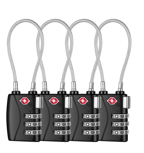 NAGE - قفل بكابل للسفر من 3 أرقام معتمد من إدارة أمن وسائل النقل من ناج، لشنط السفر ودولايب الجيم وأمتعة السفر، بلون أسود، من 4 قطع
