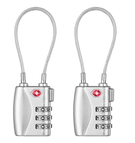 NAGE - قفل كابل برمز من 3 أرقام، قفل معتمد من إدارة أمن النقل للأمتعة والسفر بهيكل من خليط معدني، لشنط السفر والأمتعة والمدرسة والجيم (عبوة من قطعتين، فضي) من ناج