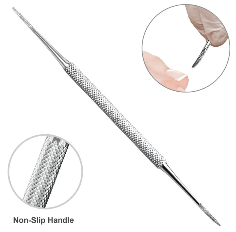 - استخدام مريح مع ملعقة دفع الزوائد اللحمية في الطرف وسكين حاد من الستانلس ستيل في الطرف الآخر، استخدمه لدفع الجلد الميت ثم تشذيب الأظافر حول الأظافر، مهم للعمل من أسفل الظفر، لأعلى وخارج، تحذير: سكين القطع حاد في الحلاقة. لا تستخدمه لدفع الزوائد اللحمية