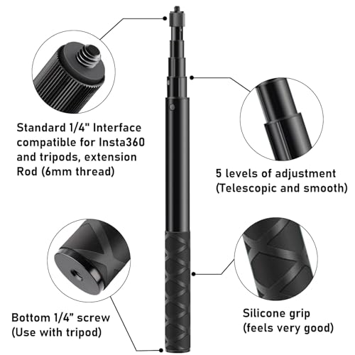 - 📸 عصا سيلفي غير مرئية لكاميرا انستا 360 والمزيد: مصمم خصيصًا لكاميرات انستا360 GO 3 وX3 وONE X2، ومتوافق مع الكاميرات الأخرى التي تحتوي على فتحات مسامير بمقاس 0.635 سم. تتضمن العبوة عصا سيلفي واحدة ومقبضًا دوارًا واحدًا، لتعزيز تجربتك في الصور الفيديوهات.