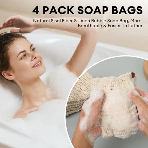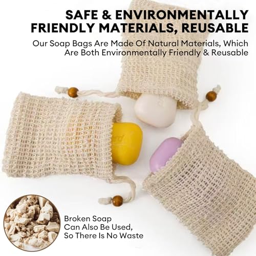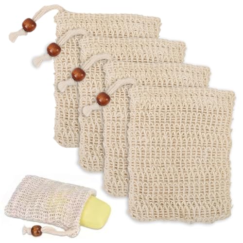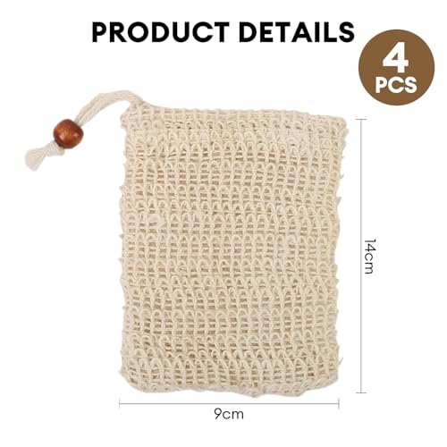 nalaina - اكياس صابون من نالينا مكونة من 4 قطع، كيس صابون مقشر من السيزال مع رباط وخرز خشبي، شبكة رغوة وتجفيف للحمام والاستحمام