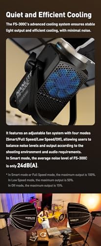 - 【تبريد هادئ وفعال】يتميز بنظام مروحة قابل للتعديل مع أربعة أوضاع (ذكي/سرعة كاملة/سرعة منخفضة/إيقاف) مما يسمح للمستخدمين بموازنة مستويات الضوضاء والإخراج وفقًا لبيئة التصوير ومتطلبات الصوت. في الوضع الذكي، يبلغ متوسط مستوى الضوضاء FS-300c 24 ديسيبل فقط (ايه)