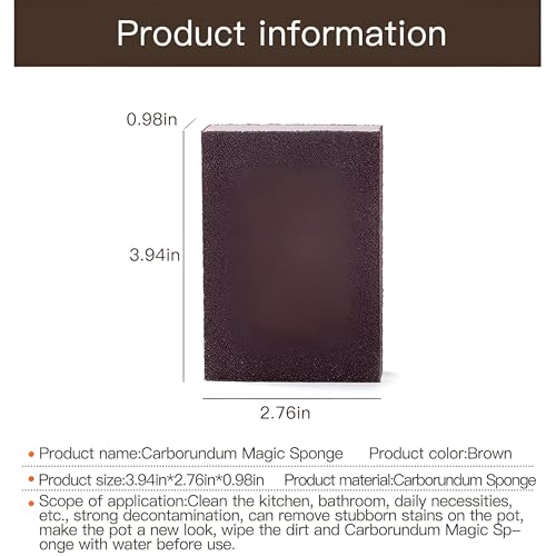 - تتضمن مواصفات المنتج وملاحظات السلامة تركيبة المواد مثل الإسفنج والألومينا والرمل الماسي؛ الأبعاد 10 × 7 × 2.5 سم؛ اللون بني؛ المحتويات ستة إسفنجات بنية؛ تتضمن التحذيرات عدم تعريضها لدرجات الحرارة العالية أو الرطوبة، احفظها بعيدًا عن الأطفال، غير مناسبة لتنظيف الطلاء القائم على الزيت، احفظه بعيدًا عن النار، وعند استخدام الجانب اللامع على وعاء الاختبار أولاً في حالة غير واضحة منطقة لتجنب الخدش ؛ للحصول على أفضل النتائج، انقعيه بقليل من المنظف قبل