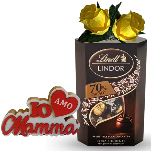 NARAMAKI - هدية فوندان ليندت ليندور لعيد المرأة 2010 من ناراماكي، 200 جرام + ديكور خشبي مع نقش كلمة Mother + ورود صناعية (شيكولاتة ليندت غامقة بنسبة 70%)
