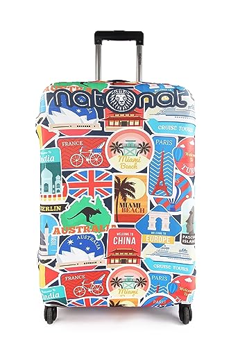 natOnat - غطاء واقي لشنط السفر من ناتونات - غطاء شنطة سفر بنقشة ملونة - قابل للتمدد وقابل للغسل، مصنوع من سباندكس وبوليستر - يحمي من الأوساخ والخدوش - تصميم ملصقات سفر - مناسب لشنطة مقاس 46 - 53 سم