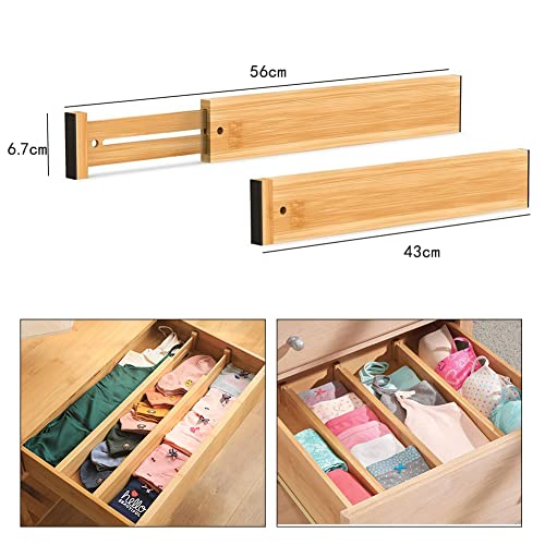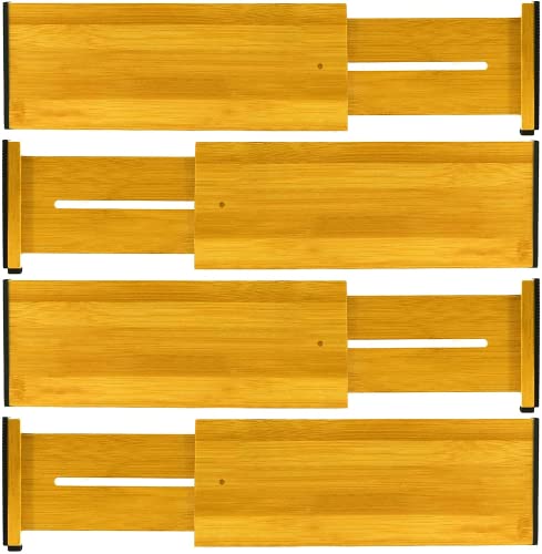Bedeco - مقسم ادراج من الخيزران الطبيعي، قابل للتعديل (43-56 سم)، نظام منظم ادراج زنبركي، منظم ادراج للمطبخ والحمام وغرفة النوم والخزانة والمكتب، مجموعة من 4 قطع
