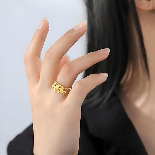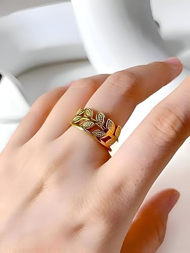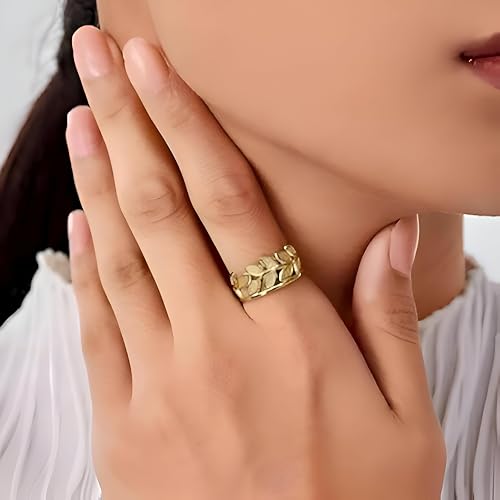 Generic - خاتم انيق طبيعي - خاتم فاخر من الستانلس ستيل مع نقش اوراق الزيتون وطلاء ذهبي رقيق، مصمم لأولئك الذين يقدرون الهدوء والفن.