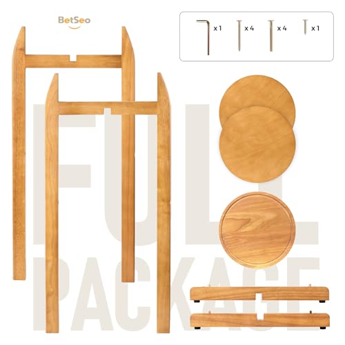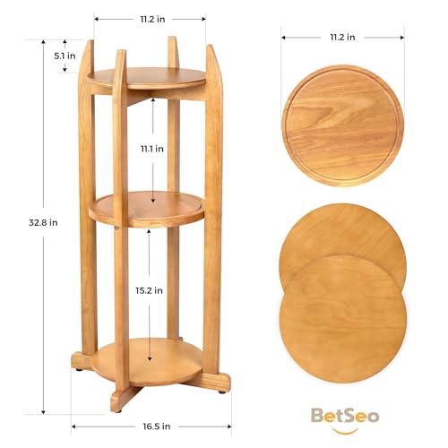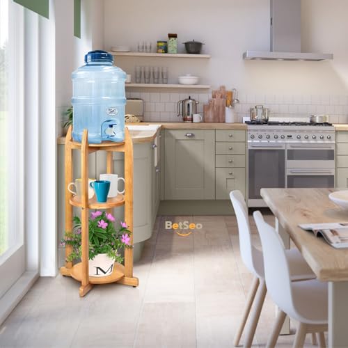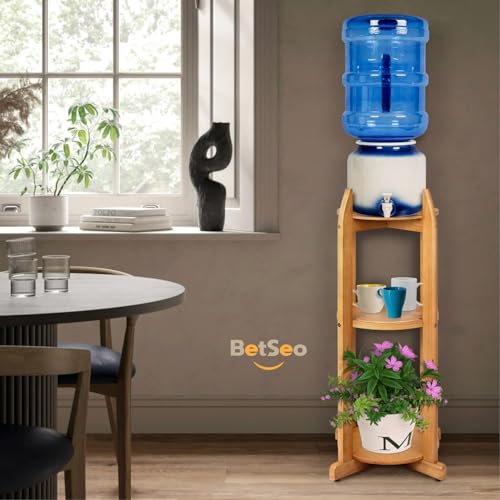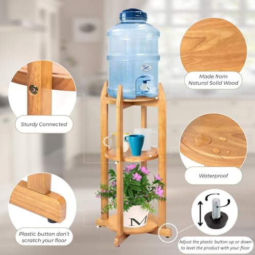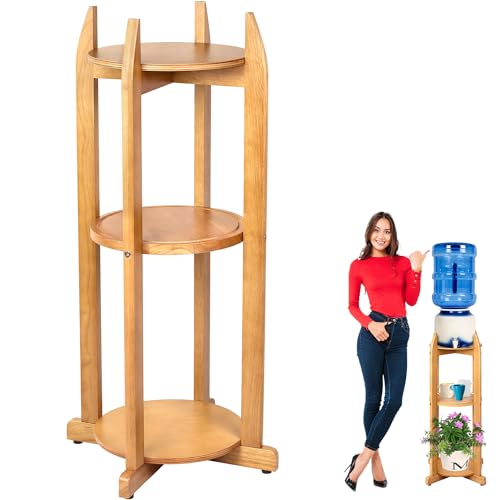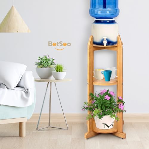BETSEO - حامل أرضي لموزع الماء خشب صلب طبيعي (ارتفاع 83 سم وعرض 28 سم) حامل أرضي لموزع المشروبات مع 3 أرفف دائرية متضمنة لزجاجات المياه/ الفخار سعة 1- 5 جالون (3.8 - 19 لتر) وإبريق الماء (لون الخشب الطبيعي)