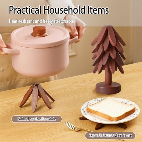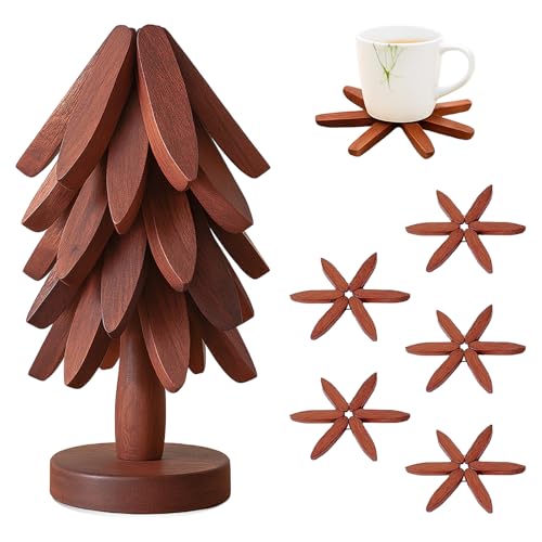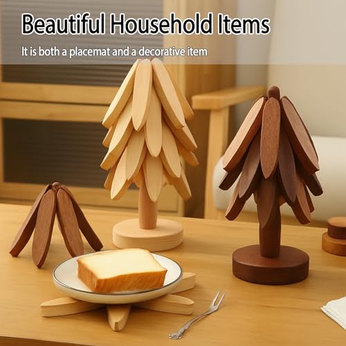 BuQueHM - مجموعة حوامل شجرة طبيعية للاطباق الساخنة - حوامل خشبية قابلة للطي للاواني الساخنة والاوعية الساخنة، 5 وسادات مقاومة للحرارة من خشب الجوز مع حامل شجرة الكريسماس (لون خشب الجوز، 5 حوامل وحامل واحد)