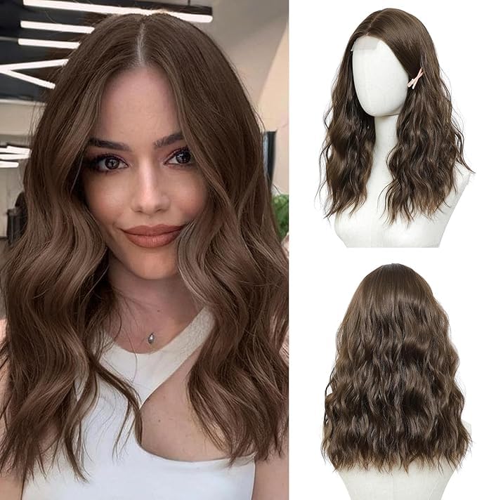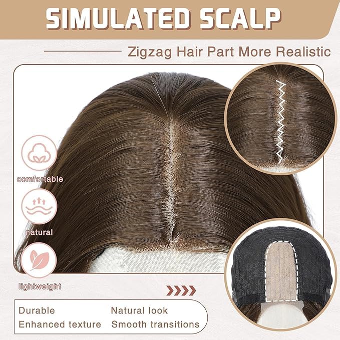 Generic - شعر مستعار بني مموج طبيعي مع فروة رأس صناعية، شعر طويل، جزء متعرج، شعر صناعي مقاوم للحرارة