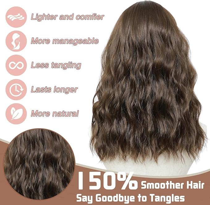 - الملمس والأناقة: شعر مستعار صناعي بني مموج طويل مع ملمس محسن وانتقالات سلسة، مما يوفر حركة ومظهر طبيعيين