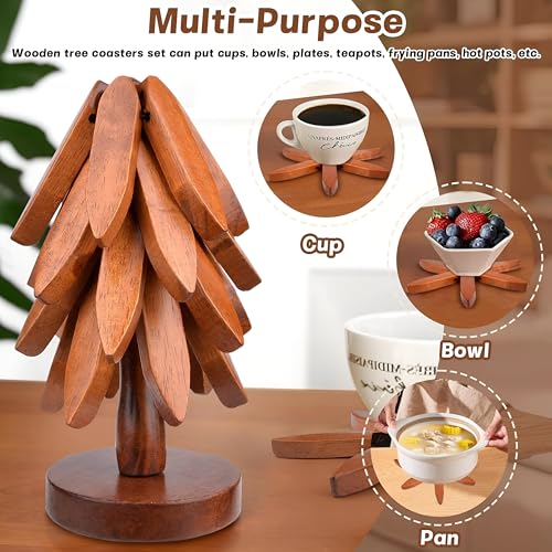 - تتميز هذه المجموعة بتصميم فريد من نوعه لشجرة الكريسماس حيث تتراكم أربع قواعد أكواب خشبية قابلة للطي معًا لتشكيل ديكور احتفالي كامل، تمزج الجمال الفني مع حماية الطاولة العملية لأي مكان منزلي.