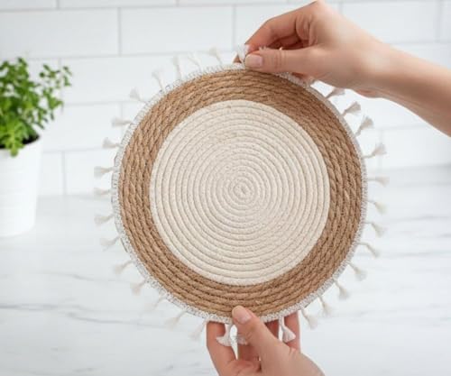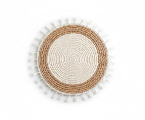Generic - قاعدة أكواب دائرية بنسيج محبوك من الروطان الطبيعي ومزينة بشراشيب بنمط بوهيمي طبيعي، سميكة وقابلة للغسيل، مثالية لتزيين أطباق التقديم والطاولة، تصميم يدوي أنيق، مناسبة للاستخدام المنزلي والمقاهي