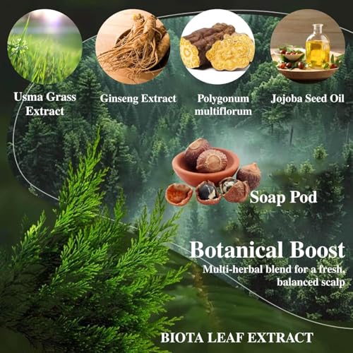 - غني بعشب عثمان والزيوت العشبية - غني بعشب يوسما والجوجوبا والجينسنغ ومستخلصات أوراق التوت للمساعدة في تغذية الشعر ودعم العناية بفروة الرأس.
