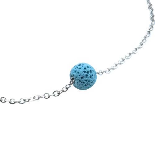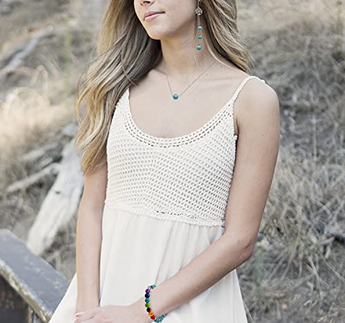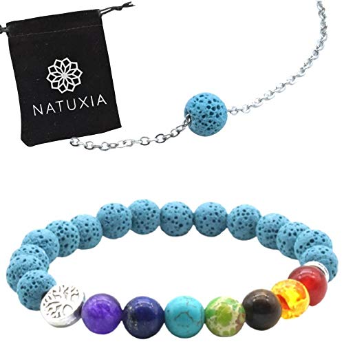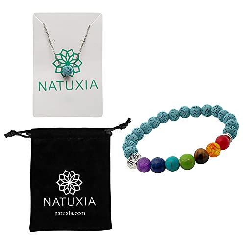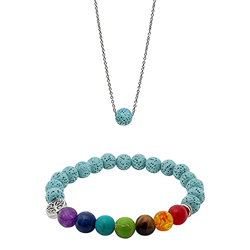 Generic - مجموعة مكونة من عقد وسوار من حجر بركاني للعلاج العطري مزينة باحجار بالوان الشاكرات السبع وخرزة على شكل شجرة الحياة (تركواز)
