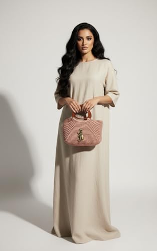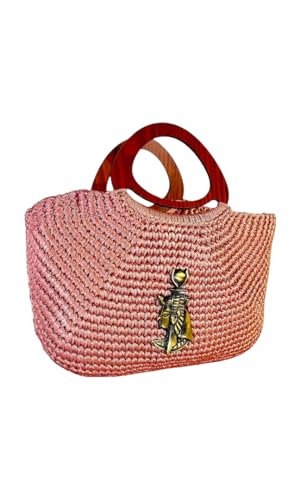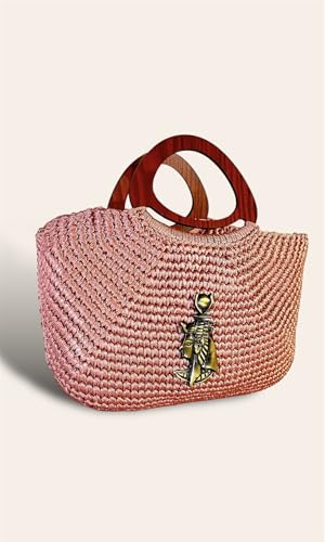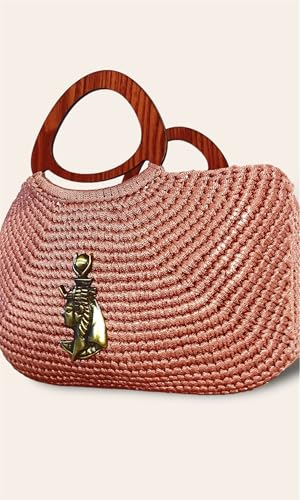 حت حور - شنطة يد كروشيه يدوية الصنع بحلية بحرية، خيوط حريرية وردية، مقبض خشبي، مرساة نحاسية، نمط كاجوال انيق
