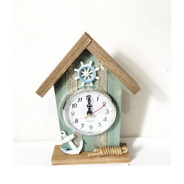 Generic - ساعة حائط بحرية، تصميم منزل خشبي مع دفة سفينة ومرساة، أخضر مينت وخشب طبيعي