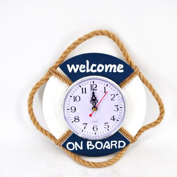 Generic - ساعة حائط بعبارة «Welcome on Board» بتصميم حلقة الحياة باللونين الكحلي والأبيض مع حبل زينة