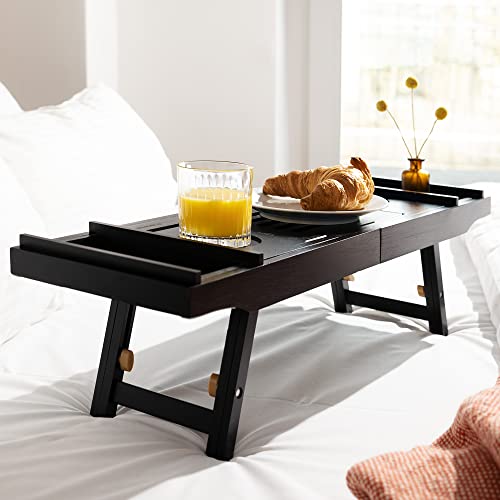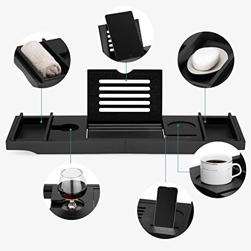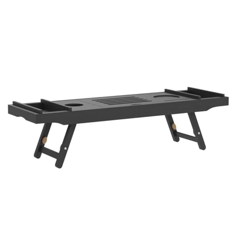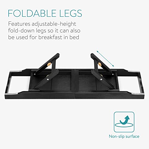 Navaris - نافاريس صينية سرير وحمام - رف خشبي مع ارجل قابلة للطي - رف جسر لحوض الاستحمام من الخيزران مع حامل للكتب او التابلت - اسود، بامبو