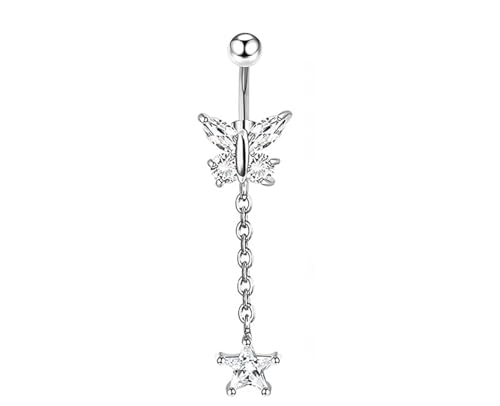 BIJOUX BEAUTIQUE - مجوهرات ثقب السرة على شكل فراشة ونجمة متدلية على شكل قضيب منحني - ابيض وفضي