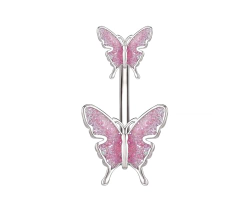 BIJOUX BEAUTIQUE - مجوهرات ثقب سرة البطن على شكل فراشة مزدوجة منحنية - بينك وفضي