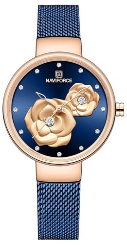 Naviforce - ساعة نافافورس 5013 RG-BE-RG شبكية ستانلس ستيل فيروزي- انالوج دائري للنساء - ذهبي