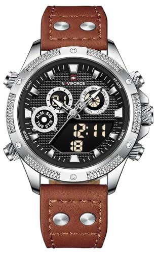 Naviforce - نافي فورس ساعة يد رقمية كرونوغراف رياضية مقاومة للماء بسوار جلدي وشاشة عرض مزدوجة مضيئة للرجال 9224 بني