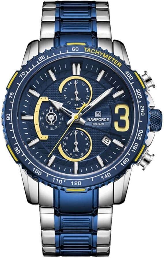 Naviforce - نافي فورس ساعة كوارتز انالوج للرجال - كرونوغراف، 3 اقراص فرعية، سوار من الستانلس ستيل، عرض التاريخ، مقاومة للماء حتى عمق 50 متر، فضي - ازرق