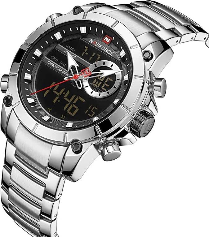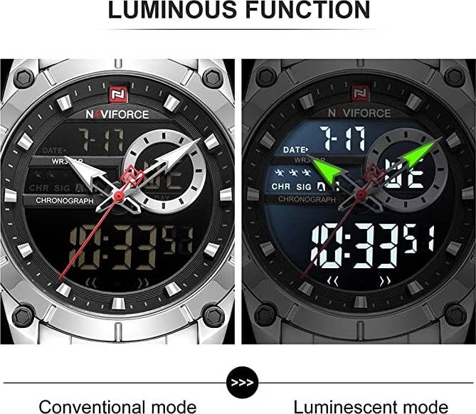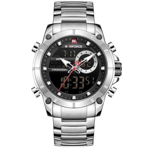 Naviforce - ساعة كوارتز انالوج للرجال - عرض التاريخ، سوار من الستانلس ستيل، مؤشرات مضيئة، مقاومة للماء حتى عمق 30 متر، فضي - اسود