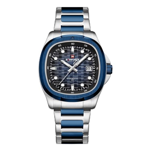 Naviforce - نافي فورس ساعة كوارتز انالوج للرجال - هيكل فضي، مينا اسود، سوار ستيل اسود، عرض التاريخ، مقاومة للماء حتى عمق 30 متر، فضي-ازرق