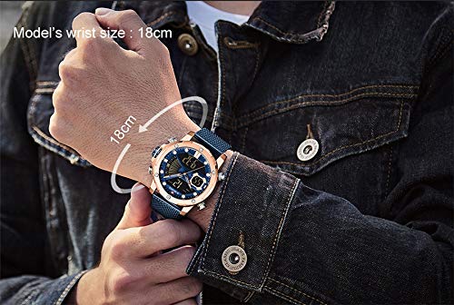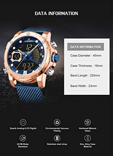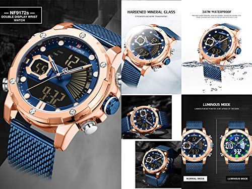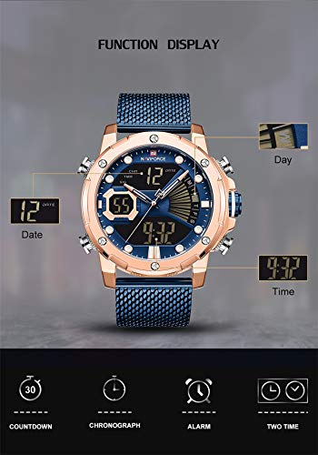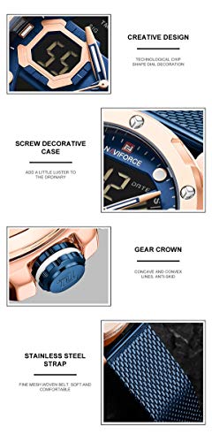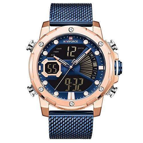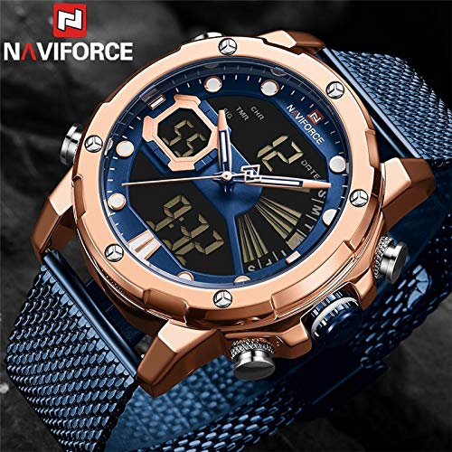 NAVIFORCE - ساعة يد من نافي فورس، بتصميم رياضي ديجيتال، تتميز بحركة كوارتز مصنوعة من الستانلس ستيل، عسكرية من علامة تجارية فاخرة للرجال لون ازرق، وروز وجولد، (NF9172-BK- ازرق), أزرق