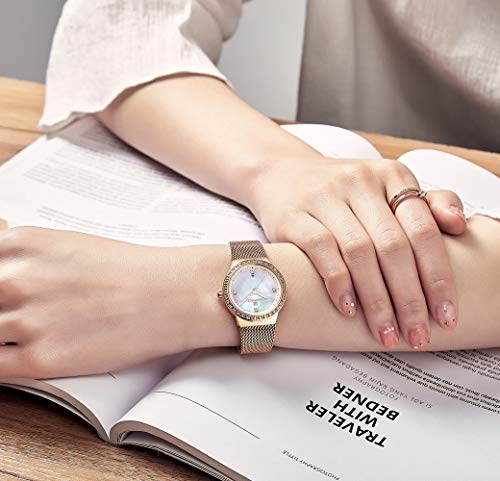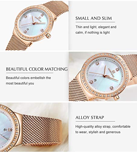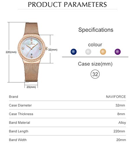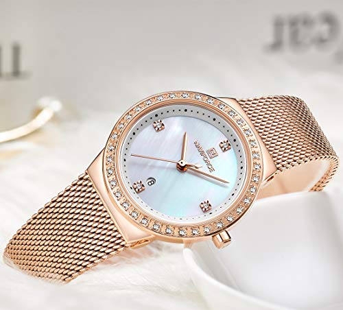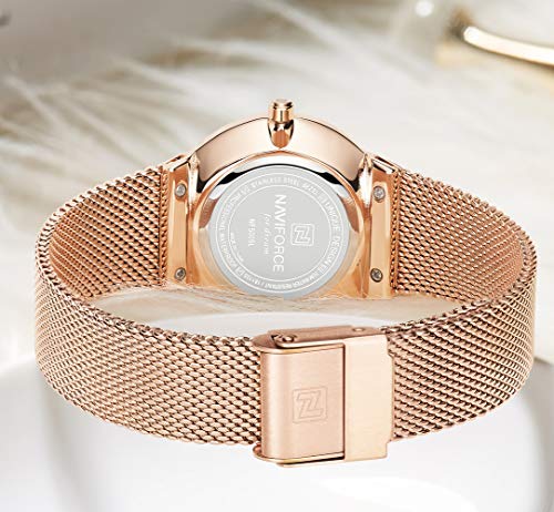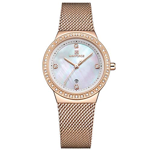 Naviforce - ساعة انالوج بعقارب كوارتز مقاومة للماء وكاجوال وفاخرة وعصرية بسوار من الستانلس ستيل والماس للنساء, ذهبي وردي
