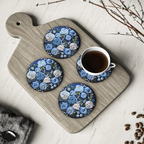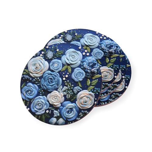 Generic - قاعدة أكواب خشبية بتصميم دائري متينة ومقاومة للحرارة على شكل زهور ملونة للمطبخ والمنزل والمكتب، مجموعة من 4 قطع، كحلي وأبيض